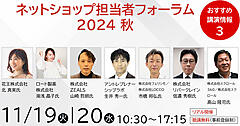 11月19日(火)・20日(水)に大型オフラインECイベント「ネットショップ担当者フォーラム2024 秋」を東京・虎ノ門ヒルズフォーラムでリアル開催! DHC(ディーエイチシー)、ハルメクホールディングス、プラス、コーセープロビジョンの社長や、ヤマダデンキ、イオンネクスト、赤ちゃん本舗、フェリシモ、スクロール360、リバークレイン、日本プロサッカーリーグ(Jリーグ)、ユナイテッドアローズ、花王、ロート製薬といった有名企業が登壇します。