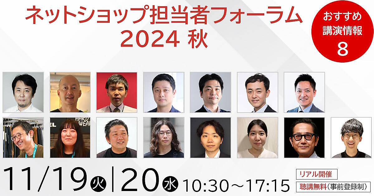 EC事業成功につながる豊富なノウハウを持つ有識者が登壇し、聴講者の通販・EC事業運営の学びにつながるセッションをお届けするオフラインイベント「ネットショップ担当者フォーラム 2024 秋」を来週11月19日(火)+20日(水)に開催。全50講演超のセミナーをすべて無料で聴講できます