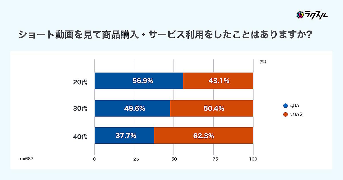 ショート動画を見て商品購入・サービス利用をしたことがあるかを聞いたところ、「ショート動画を見て商品購入やサービス利用の経験がある」と回答した人は全体で約47%だった。年代別に見ると、20代は56.9%、30代は49.6%、40代は37.7%が「ある」と回答した。