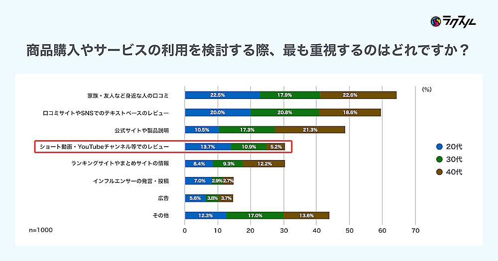 印刷・集客支援のプラットフォームを運営するラクスルが実施した調査によると、ショート動画を見て商品購入やサービスの利用をしたことがある人は約半数を占めている。また、商品の購入やサービスの利用を検討する際に最も重視するものとして「ショート動画・YouTubeチャンネル等でのレビュー」と回答した人が20代を中心に一定数見られた。