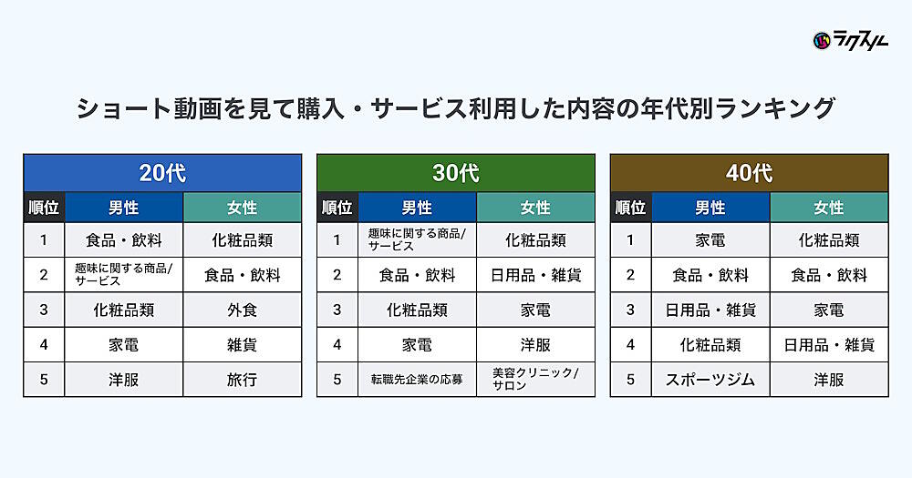 ショート動画を見て購入・サービス利用をした内容の年代別ランキングでは、女性が20代、30代、40代とも「化粧品類」が1位だったが、男性は20代の1位が「食品・飲料」、30代の1位は「趣味に関する商品/サービス」、40代の1位は「家電」となっている。