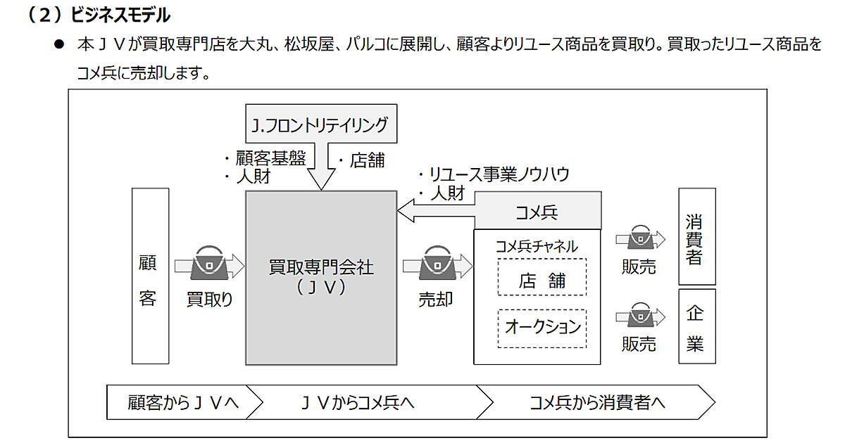 手がけるのは、大丸・松坂屋・パルコで買取専門店を展開し、顧客からリユース品を買取り、買い取ったリユース品をコメ兵に売却する事業。コメ兵のリユース事業ノウハウや人材を活用する。なお、2025年夏に1号店をオープンする予定。