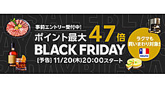 「楽天市場」では「楽天市場のブラックフライデー ポイント最大46.5倍!」と題して11月21日20時から11月27日1時59分まで実施する。