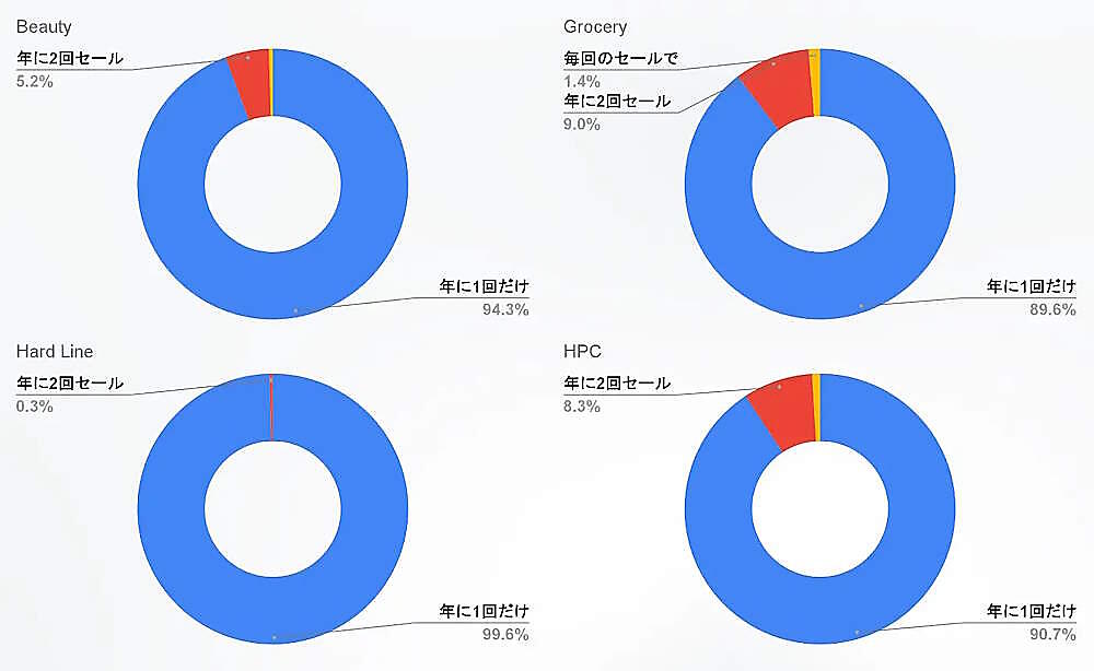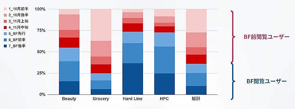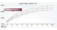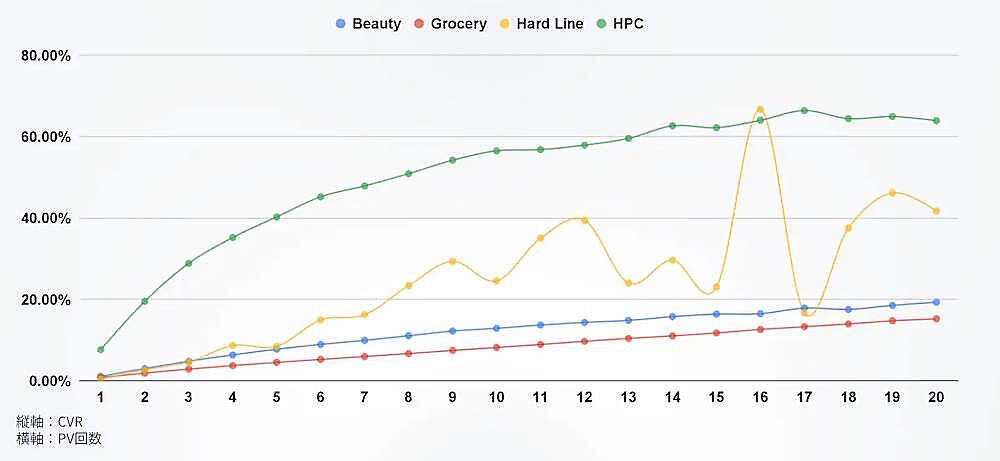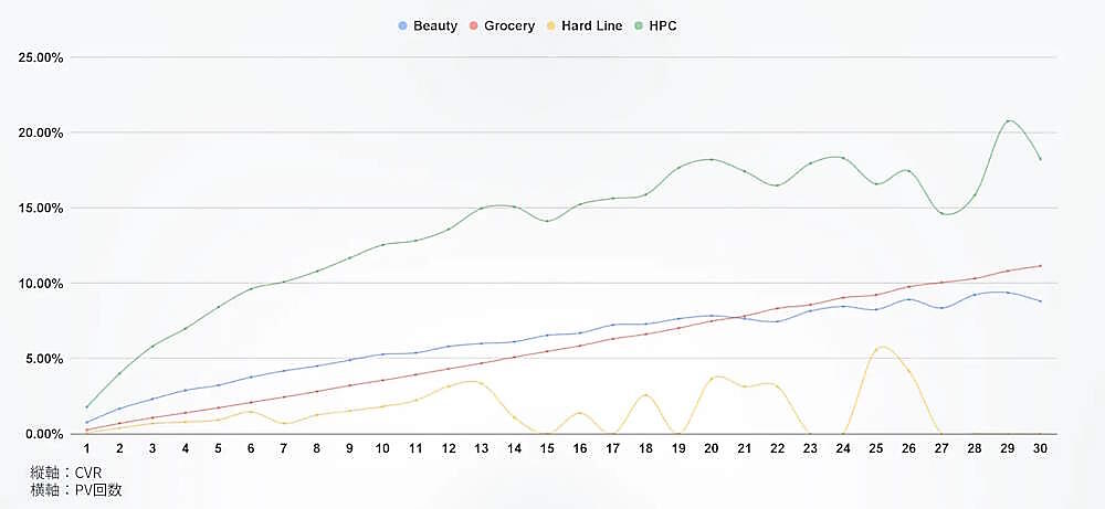 「ブラックフライデー」期間より前に多く閲覧したユーザーほど期間中でのCVRが高い傾向にある。「HPC(ヘルス&パーソナルケア)」「Hard Line(家電・PC周辺機器など)」はPV回数13回程度で伸びが緩やかもしくは鈍化しているが、「Beauty(化粧品)」「Grocery」は30回まで閲覧数に比例してCVRが伸びている。