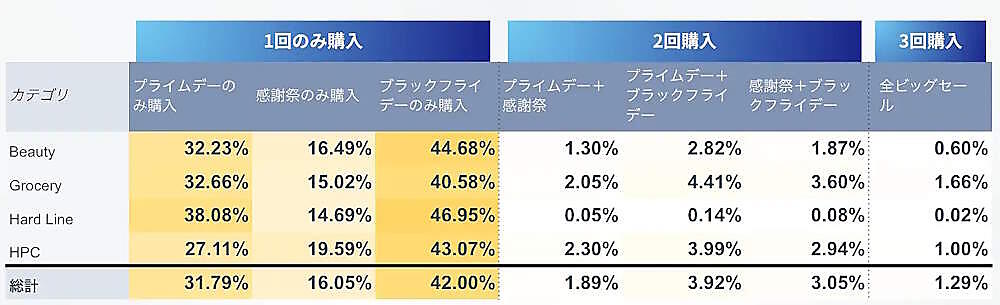 さらに、セールごとかつカテゴリごとの購入回数を調査した結果、「ブラックフライデー」でのみ購入するユーザーが最も多く、非参加は機会損失につながる可能性が高い。10月の感謝祭から期間があまり開いていないが、「ブラックフライデー」で獲得できるユーザーは異なるため、「可能な限り『ブラックフライデー』のセール参加には注力していくと良い」(ウヴン)としている。