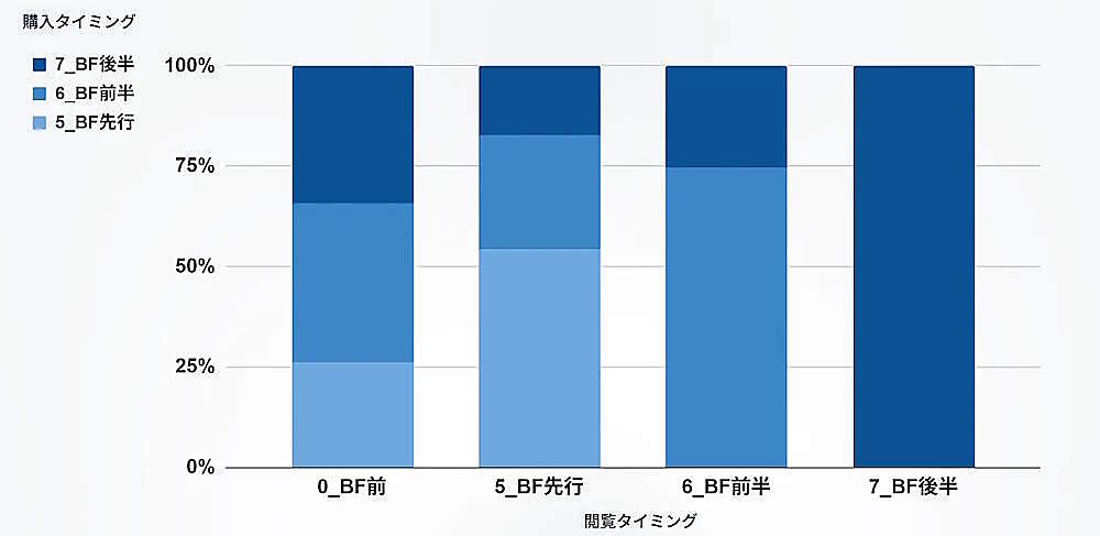 また、購入ユーザーのうち、セール本番前半で初回閲覧したユーザーの75%がそのまま商品を購入。先行セールで閲覧したユーザーの約45%がその場で購入せず、セール本番で商品を購入している。