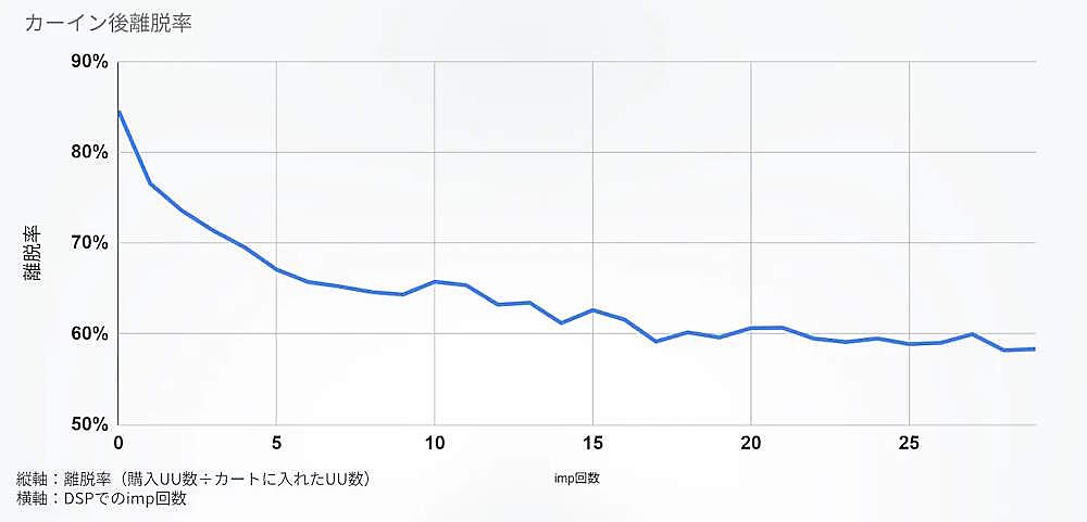 広告インプレッション数に対するカートに商品を入れた後の離脱率を見ると、離脱率は広告インプレッション数によって下がる傾向にある。もともと85%程度ある離脱率が、広告(Amazon DSP)に接触することで、35%ほど離脱率を改善できる可能性が高くなっているとした。