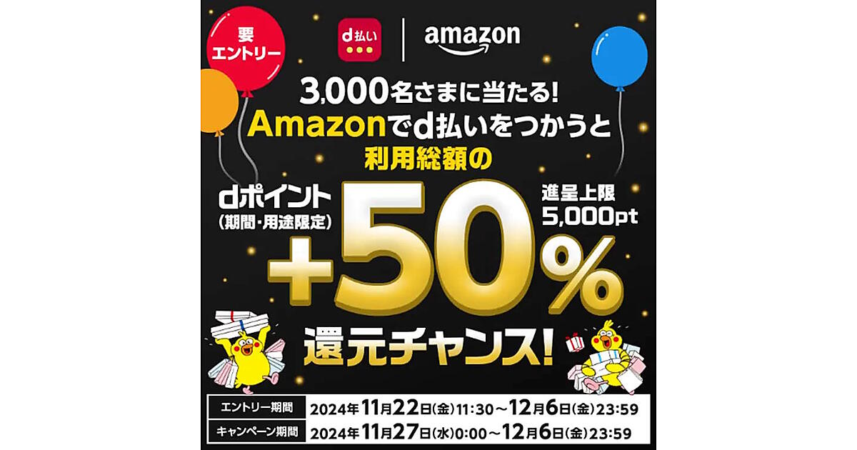 先行セールを含む「Amazon ブラックフライデー」の期間中(11月27日0時~12月6日23時59分まで)、「Amazon.co.jp」での買い物で「Amazon dポイント10%還元キャンペーン」(dポイントキャンペーン)「3000名さまに当たる!Amazonでd払いをつかうとdポイント+50%還元キャンペーン」(d払いキャンペーン)を展開する。