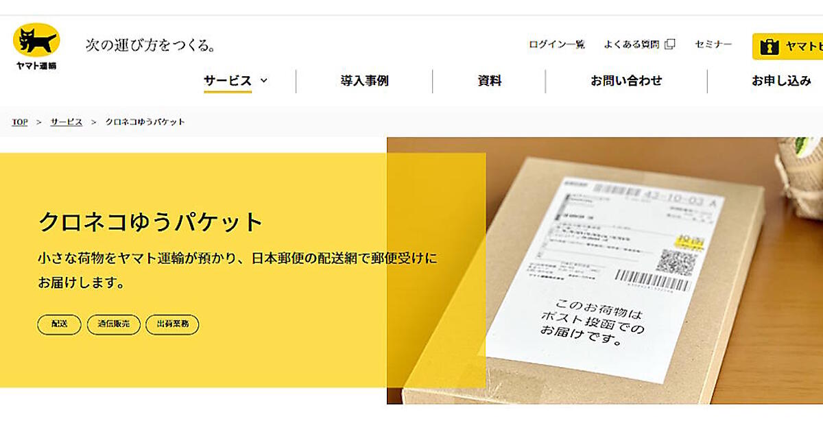 「クロネコゆうパケット」は、書籍・衣類・CDなどの小さな荷物をヤマト運輸が預かり、日本郵便の配送網を活用して郵便受けに届けるサービス。利用には、ヤマト運輸との法人(掛売り)契約が必要となる。