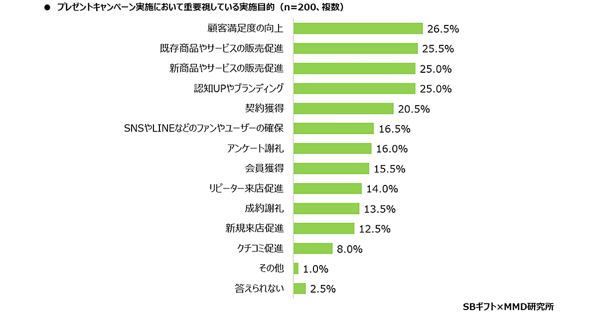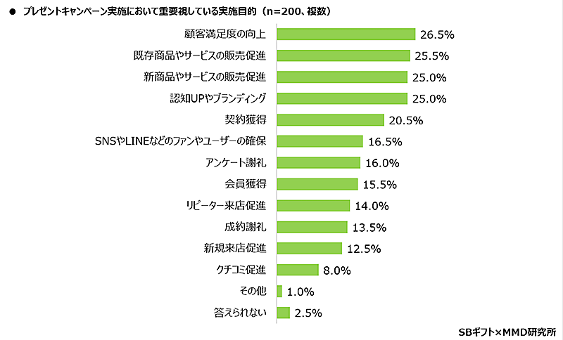 プレゼントキャンペーン実施において重要視している目的を聞いたところ、最多は「顧客満足度の向上」(26.5%)で、次いで「既存商品やサービスの販売促進」(25.5%)「新商品やサービスの販売促進」「認知UPやブランディング」(いずれも25/0%)だった。