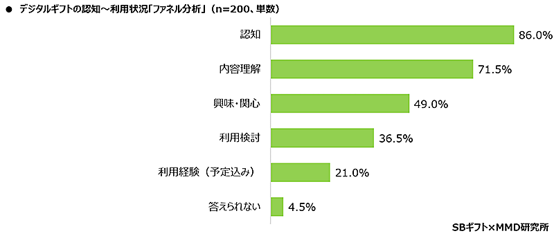 デジタルギフトの利用状況について、最多は「大体の内容はわかるが、利用や利用の検討をしたことはない」(22.5%)。次いで「キャンペーンでデジタルギフトサービスを利用したことがある」(18.5%)「利用したことはないが、現在利用を検討している」(15.5%)だった。