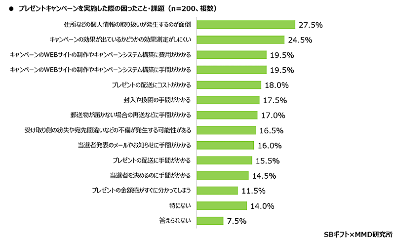 プレゼントキャンペーン実施時の困ったこと・課題、最多は「住所など個人情報の取り扱いが発生するのが面倒」