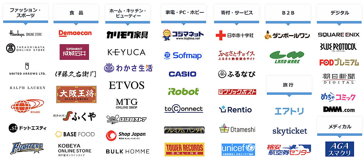 現在、日本国内では2万社以上の企業が導入、10万サイト以上が利用している。その適用範囲は幅広く、ファッション、食品、家電といった一般的な商材から、旅行サービス、フードデリバリー、デジタルコンテンツ、メディカル分野にまで及んでいる。
