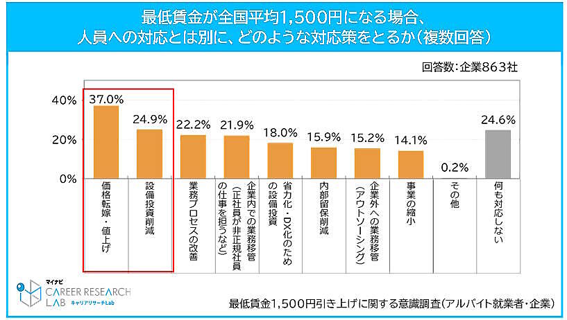 最低賃金が全国平均1500円になった場合の対応策は、「価格転嫁・値上げ」が最多で37,0%、「設備投資削減」が24.9%、「業務プロセスの改善」が22.2%だった。