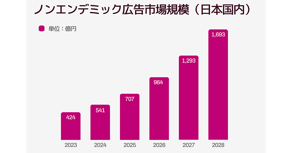 Rokt(ロクト)はデジタルインファクトと共同で、リテールメディア広告の一形態であるノンエンデミック広告市場(主要なテーマやコンテンツとは直接関連しない商品やサービスの広告)に関する調査を実施、国内ノンエンデミック広告の2024年市場規模は前年比28%増の541億円となる見通しで、2028年には2024年比で約3倍の1693億円になると予測した。