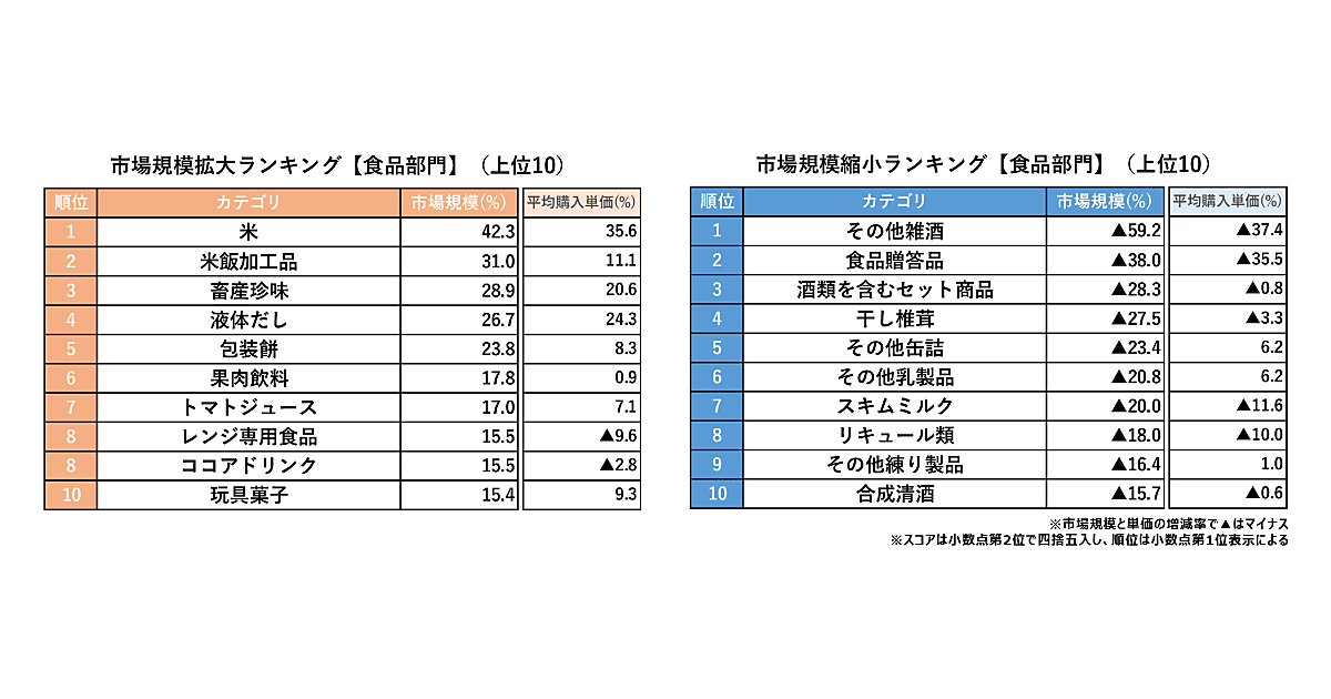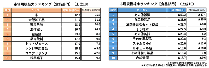市場規模拡大ランキングで食品部門の1位は「米」で前年比42.3%増、2位はパックご飯の「米飯加工品」で同31.0%増、3位はカルパスやビーフジャーキーなどの「畜産珍味」の同28.9%増だった。