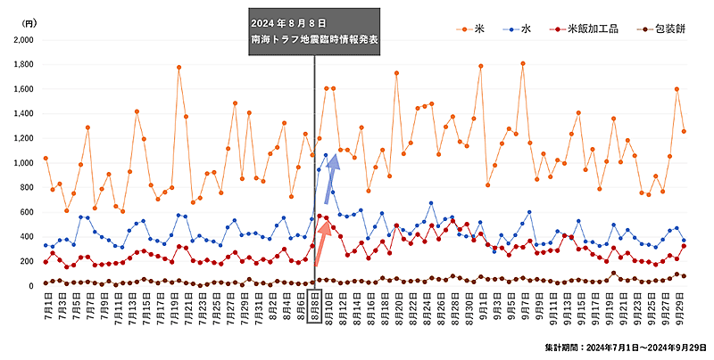 一方、食品部門上位の「米」「米飯加工品」「包装餅」と、ランク外の「水」の100人あたりの購入金額を日次推移で見ると、2024年8月8日の「南海トラフ地震臨時情報」発表後に「水」と「米飯加工品」が急上昇、以降も高めに推移した。災害に対する警戒から、備蓄目的で購入された様子がうかがえる。