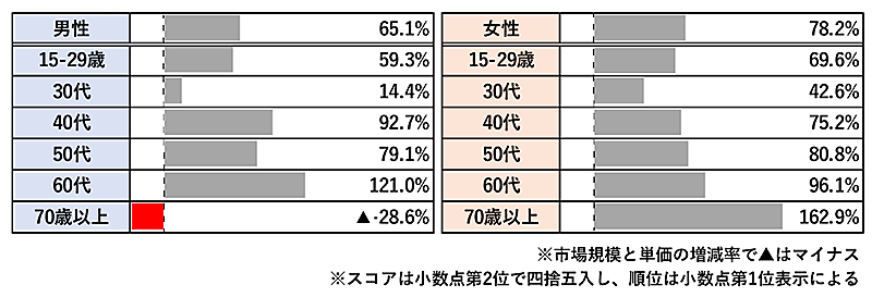 「その他男性化粧品」の市場規模を性別・年代別に見ると、男性全体では前年比65.1%増で、男性の40歳~60歳代の購入が伸長した。伸長した順は、男性60歳代が同121.0%増、男性40歳代が同92.7%増、男性50歳代が同79.1%増。女性による購入も伸長しており、女性全体では同78.2%増となっている。