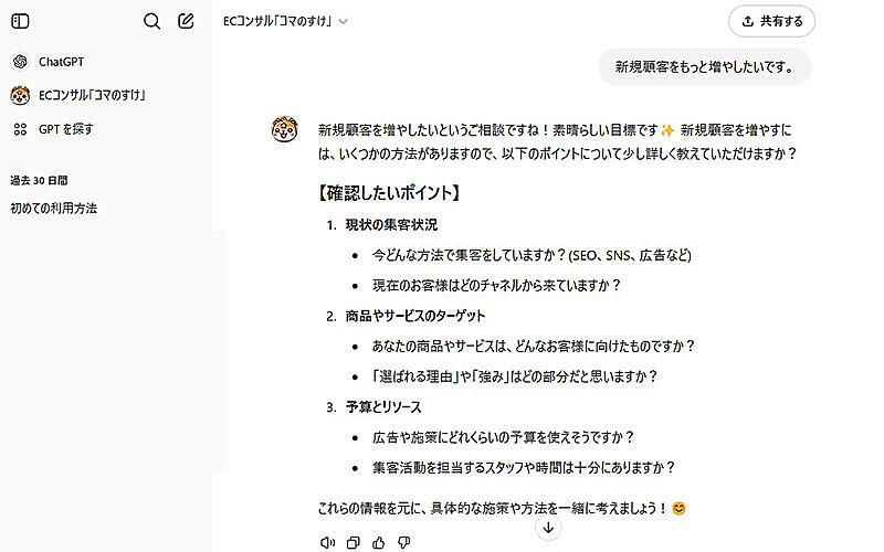 「具体的にはどうすればいいの?」「自分の商品の場合は?」――こんな個別の課題に「AIコンサルタント」が回答します。無料で24時間使い放題。自社のECビジネスの課題・悩みに「いつでも」「どこでも」答えを提供する「AIコンサルタント」を活用してみてはいかが?