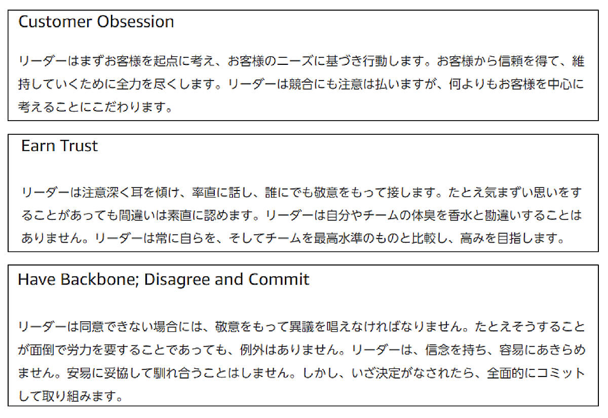 メールのやり取りも会議でも常に「Leadership Principles」の考え方が皆の根底にあり、事あるごとに「これは本当に“Earn Trust(注意深く耳を傾け、率直に話し、誰にでも敬意をもって接する。そしてチームを最高水準のものと比較し、高みをめざす)”に沿っているか?」などとディスカッションするのです。