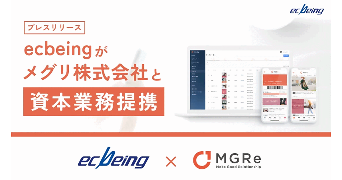 ECサイト構築プラットフォーム「ecbeing」を提供するecbeingは12月12日、アプリプラットフォーム「MGRe(メグリ)」を提供するメグリと資本業務提携を締結したと発表した。