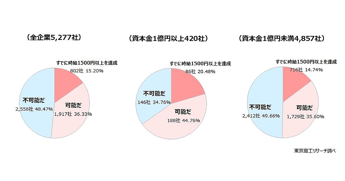 東京商工リサーチが実施した「最低賃金1500円に関するアンケート」によると、最低賃金(時給)が全国平均1500円に引き上げられた場合、約5割(48.4%)の企業が引き上げは「不可能」と回答している。