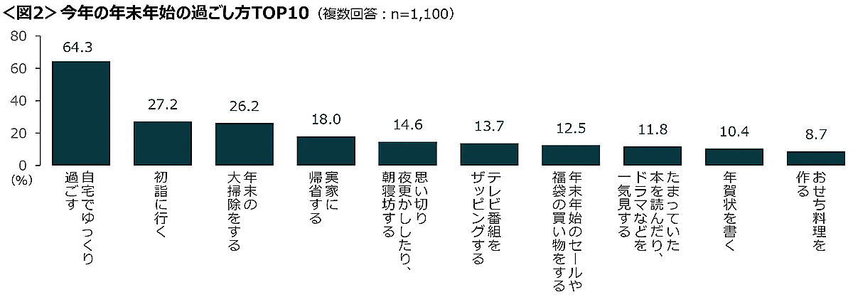 クロス・マーケティングが実施した「年末年始に関する調査(2024年)」によると、「年末年始の過ごし方」は「自宅でゆっくり過ごす」が64.3%で段トツで1位だった。