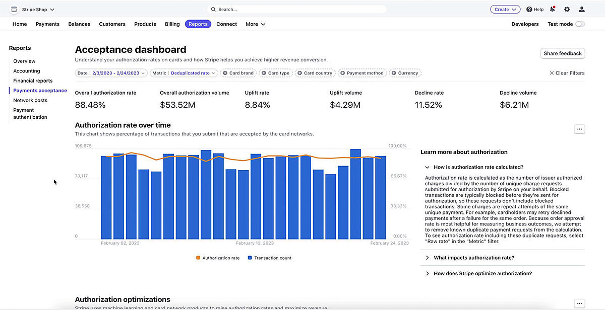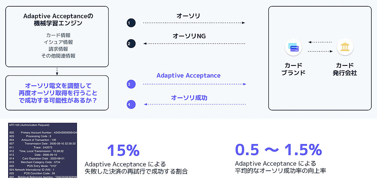 「Adaptive Acceptance」は機械学習モデルを使用し、カード発行会社に拒否された支払いをリアルタイムで再試行したり、最適化された再試行メッセージと経路選定の組み合わせを特定したりする取引承認率改善の機械学習ツール。「Adaptive Acceptance」による平均的なオーソリ成功率の向上率は0.5%〜1.5%にものぼる。確認に時間を要さず状況を知ることができ、さらに自動でオーソリ成功率の向上に役立つ機能も備えることができた。
