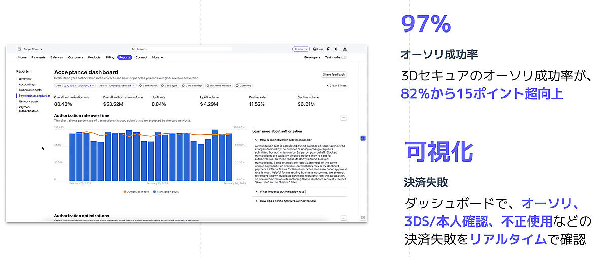 「Stripe」のダッシュボードでは、決済金額、成功か否かの承認状況、日付などの支払いの詳細などを可視化できる。何か問題があった場合は現場スタッフが確認できるため、解決策のアクションをすぐに考えられることは「Stripe」導入の大きな理由だった。さらに「Stripe」には、売り上げにつながる「Adaptive Acceptance」というオーソリの成功率を上げるための仕組みがあった。