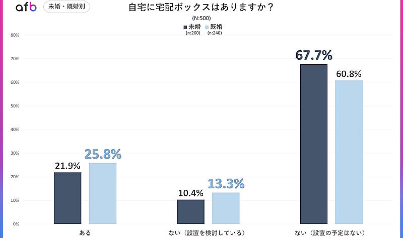 未婚・既婚別で見ると、「ある」は未婚者が21.9%、既婚者が25.8%、「ない(設置を検討している)」は未婚者が10.4%、既婚者が13.3%。「ない(設置の予定はない)」は未婚者が67.7%、既婚者が60.8%。「既婚の方は家を建てる際に宅配ボックスを設置したり、あらかじめ設置されているファミリー向けの物件を選んだりするケースが多いのかもしれない」(フォーイット)と推測している。