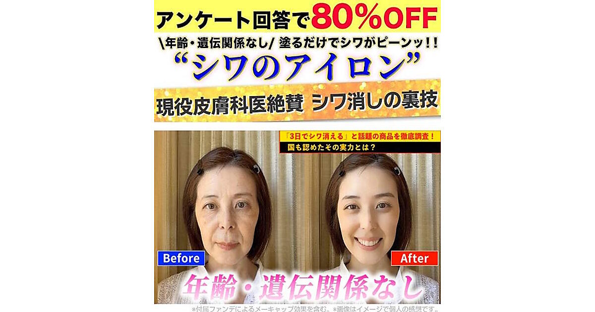 VERIFYは7月23日~29日の間、商品の効能について「\年齢・遺伝関係なし/塗るだけでシワがピーンッ!!」「本当に塗るだけで顔のシワが完全に消えた!?んです!!」などと広告。商品を塗布するだけでしわやしみを消すことができるかのような表示をしていた。
