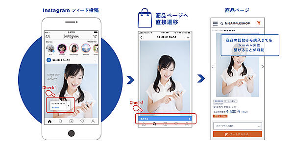 この状況に対して「futureshop」では、Instagramの「ショッピング機能」に標準で対応。商品カタログ情報を事前に登録しておけば、画像内にタグを付与でき、このタグからECサイトへと誘導できるようになる。