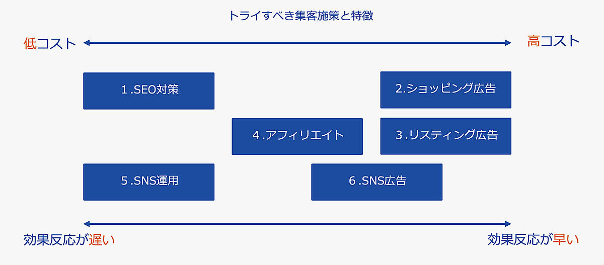 このような環境下の集客施策はどうあるべきか。一般的には、SEO施策、ショッピング広告、リスティング広告、アフィリエイト、SNS運用、SNS広告の6種類があるとされるが、次の図のようにコストや効果の出やすさに違いがある。そのため、その特性と自社ECのタイプを考慮して選択すべきだと安原氏は説明する。