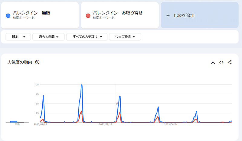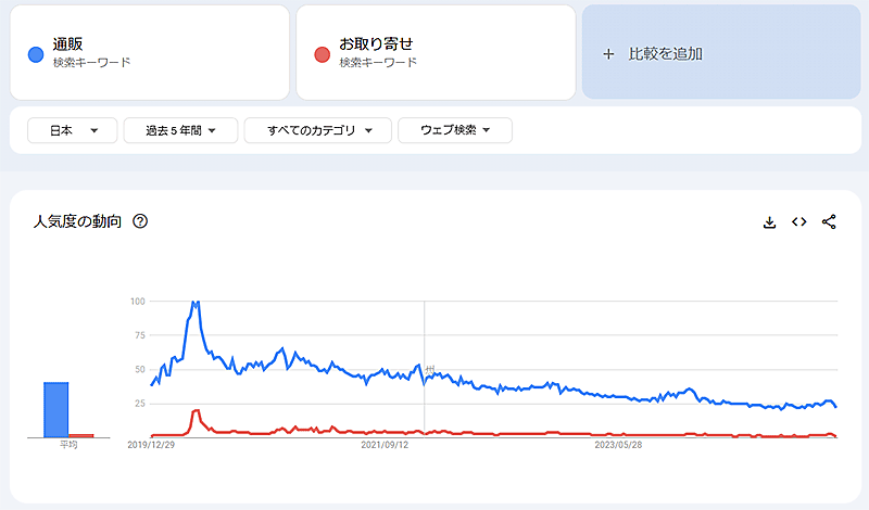 2024年の展望で「旅行や観光などレジャー需要の『コト消費』に向かうのではないか」と触れました。下の図は「Googleトレンド」の過去5年の「お取り寄せ」や「通販」の推移ですが、コロナ禍の巣ごもり需要以降、緩やかに右肩下がりになっていることがうかがえます。初めての緊急事態宣言下のスパイクは言わずもがなですが、2021年と比較してみても2024年はほぼ半減していることがわかります。