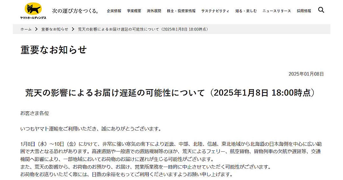 ヤマト運輸は1月8日から10日にかけて、一部地域で荷物の配送に遅れが生じる可能性があると発表した。寒気による荒天が配送に影響する可能性があるため。