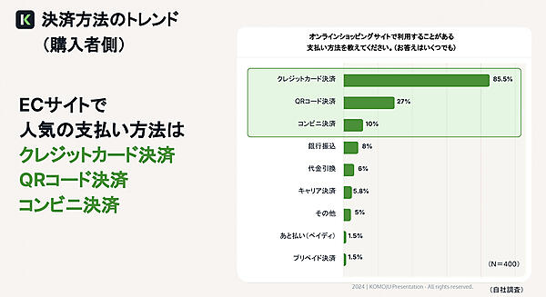 DEGICAの調査によると、ECで人気の高い決済手段の1位はクレジットカード決済で、2位がQRコード決済、3位がコンビニ決済だ。