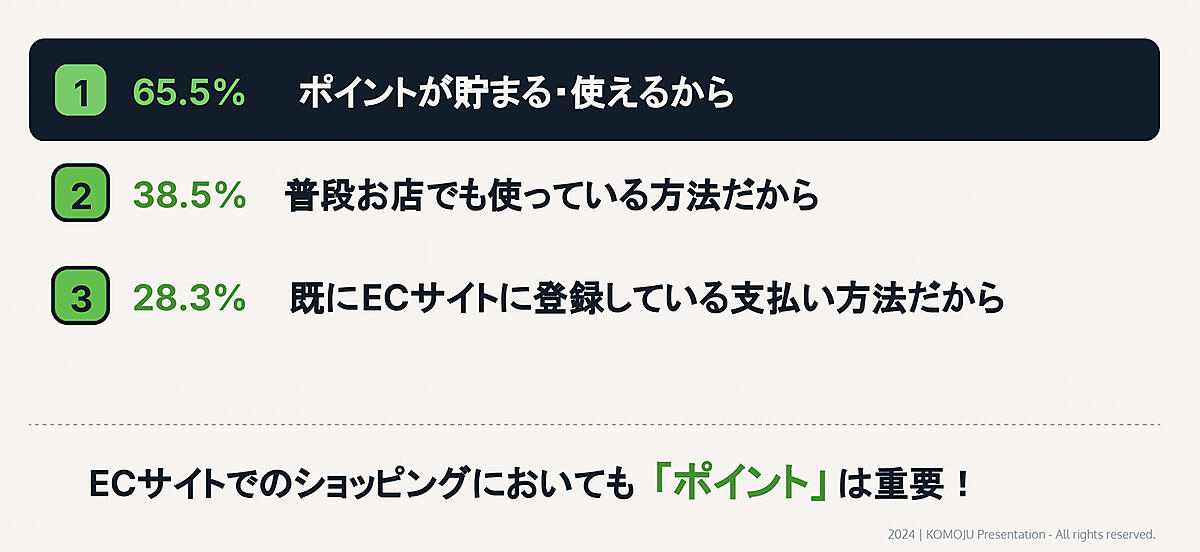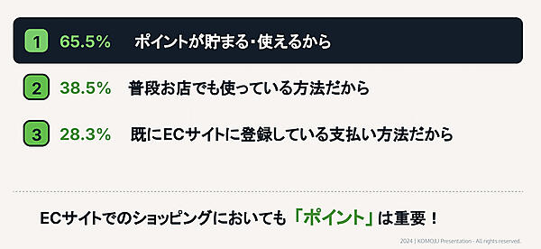 クレジットカード決済とQRコード決済が人気の理由は「ポイント」。ポイント制度の認知度や使用頻度が上がり、日常生活のなかで当たり前になっているためだ。この状況はECでも同様の流れになっている。