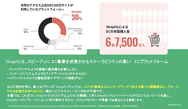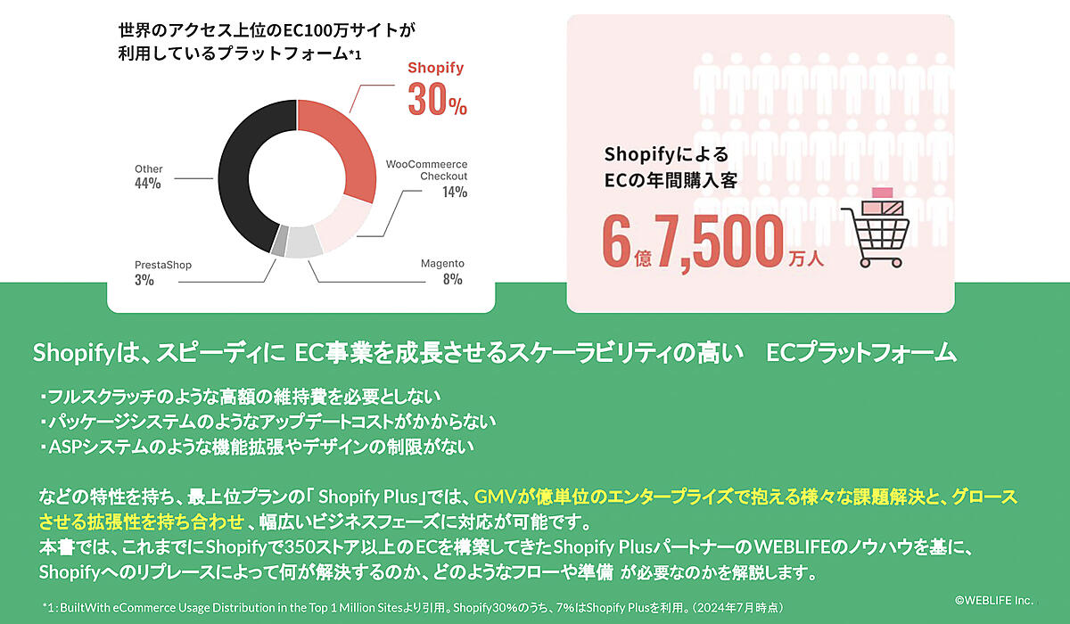 「Shopify」で構築・運用されるECサイトで買い物する年間購入客数は6億7500万人。これはEコマース全体の30%にあたるという。