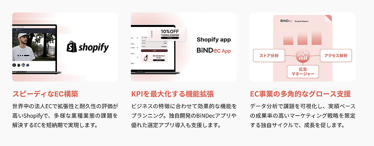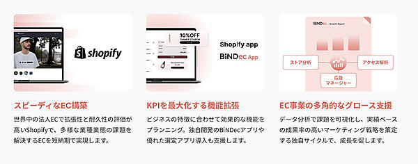 「Shopify」の機能を拡張するための独自開発のアプリケーション「BiNDecアプリ」のほか、多数の「Shopify」アプリのなかから最適な機能をコーディネートし、ECサイトの構築から運用、グロースまでを支援する。