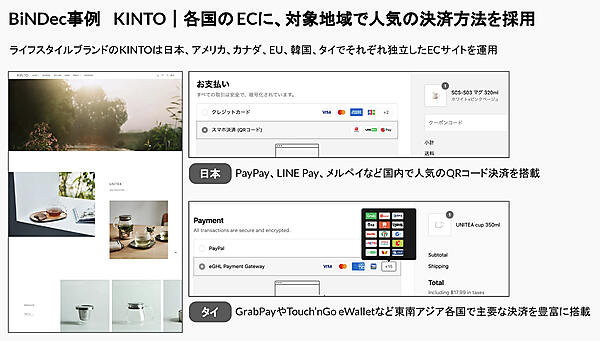 決済代行システムには「KOMOJU」を導入しており、国内では複数のQRコード決済に対応。日本のほか、アメリカ、カナダ、欧州、タイ向けにそれぞれ独立したECサイトを運用しており、海外向けにはそれぞれの国・地域に適した決済手段を提供している。