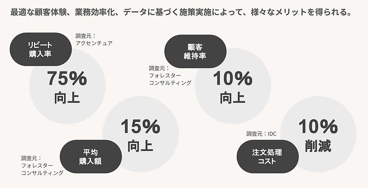 たとえば、店舗とオンラインショップを統合することにより、リピート率、平均購入額、顧客維持率の向上、事業者側のコスト削減といった効果を得ることができるとされている。