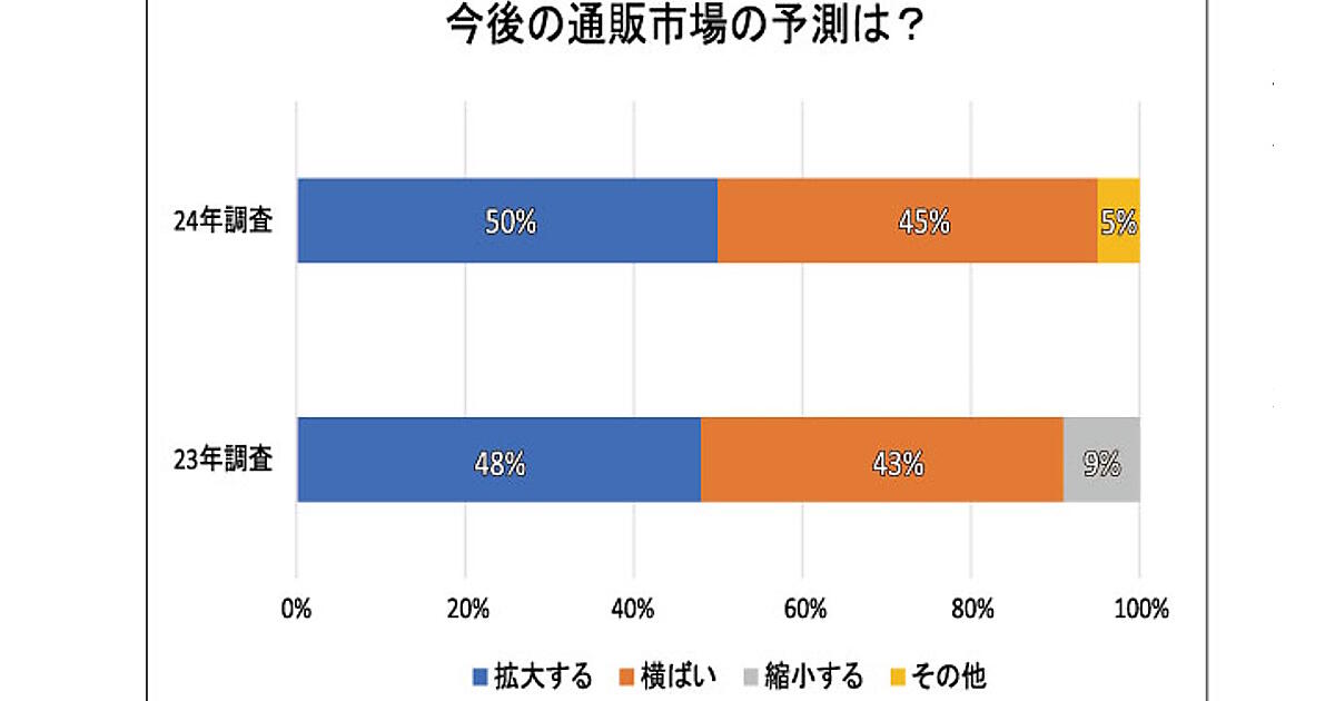 2025年の通販市場について「拡大する」との回答は50%だった。前年同期の調査から2ポイント増え、約半数で市場が拡大するとみている。