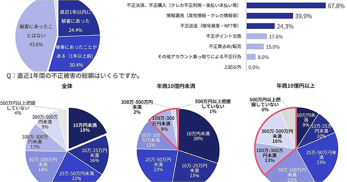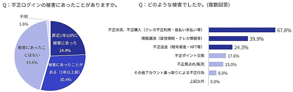 不正被害の内容は、「不正決済、不正購入(クレカ不正利用・後払い未払い等)」が67.8%、「情報漏洩(属性情報・クレカ情報等)」が39.9%、「不正送金(暗号資産・NFT等)」が24.3%だった。