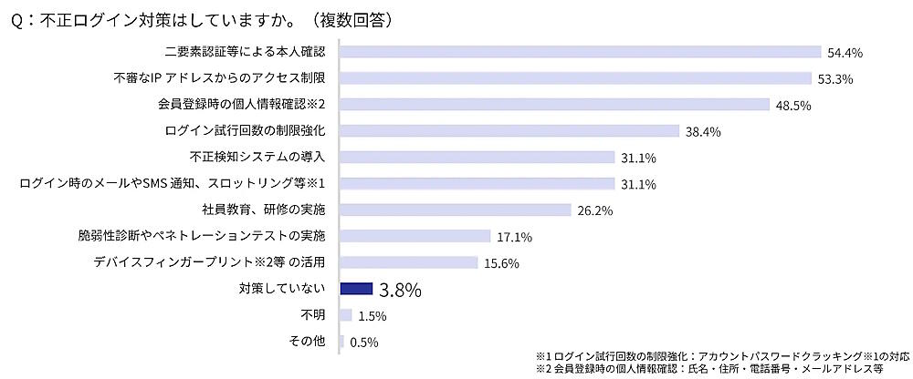 不正ログイン対策の実施については、「二要素認証等による本人確認」が54.4%、「不審なIPアドレスからのアクセス制限」が53.3%、「会員登録時の個人情報確認」が48.5%などで、「対策していない」は3.8%だった。