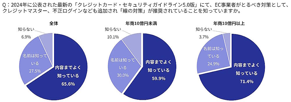 クレジット取引セキュリティ対策協議会がセキュリティ対策義務の実務上の指針として公開した「クレジットカード・セキュリティガイドライン5.0版」で提唱している、不正利用対策の「線の考え方」を知っている割合は65.6%。なかでも年商10億円以上の事業者は、71.4%が内容を理解していた。「線の考え方」とは、決済の場面(決済前・決済時・決済後)を考慮し、場面ごとにセキュリティ対策をする考え方。