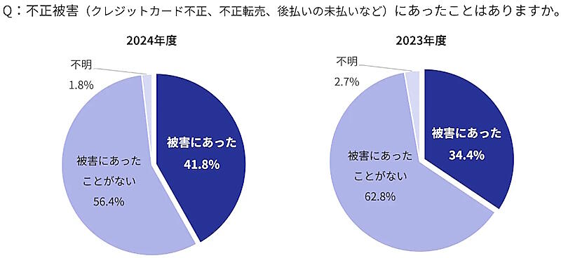 不正被害(クレジットカード不正、不正転売、後払いの未払いなど)の経験は、「被害にあった」が41.8%だった。2023年より7.4ポイント増加している。