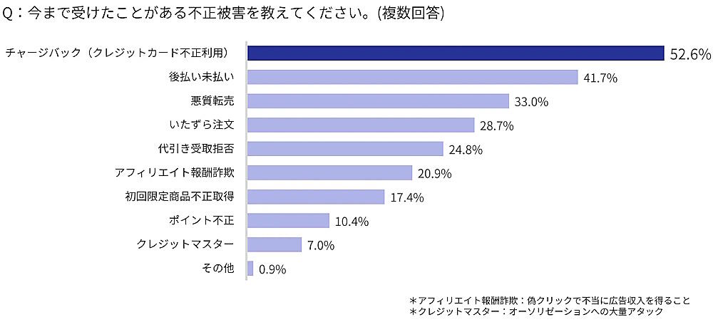 今まで受けたことがある不正被害の内容は、「チャージバック(クレジットカード不正利用)」が52.6%、「後払い未払い」が41.7%、「悪質転売」が33.0%などだった。