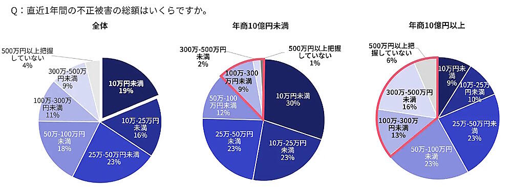 直近1年間における不正被害の総額は、「25万-50万円未満」が最も多い23%、「10万円未満」が19%、「50万-100万円未満」は18%、「10万-25万円未満」が16%。