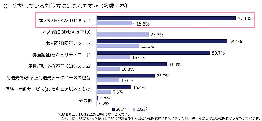 実施している対策方法は、「本人認証(EMV3-Dセキュア)」が最も多く、62.1%となっている(2023年調査では15.8%)。対策方法として2番目に多い「本人認証(認証アシスト)」は58.4%。