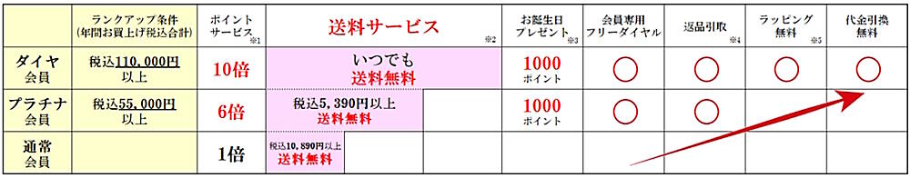 - 「プラチナ会員」:【改定前】注文金額税込5500円以上で送料無料→【改定後】同5390円以上で送料無料。差額は110円